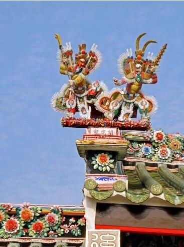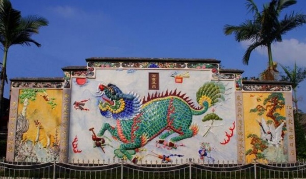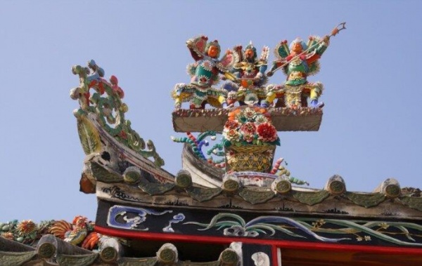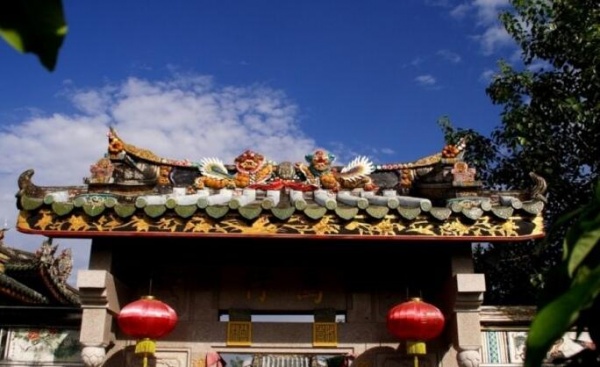 3、中脊和嵌瓷。民居中的中脊可分為高、中、低脊。一般后大廳頂為高脊,前廳為中脊,次房或花巷厝為低脊,厝頭的順延方向為垂帶。潮汕的垂帶厝頭、脊形式多樣,十分豐富。有的可與皇家的裝飾相媲美,因有潮汕嵌瓷的大量應用于中脊和垂帶頭。形成了全世界獨一無二的屋頂裝飾獨特景觀。常見的有中脊通花嵌瓷、浮肚嵌瓷。神廟脊上龍鳳及百花百鳥,瑞獸、吉祥圖案嵌瓷作品。是潮式建筑中的一道亮麗風景線。嵌瓷工藝其用料做法是采用瓷碗、瓷盤敲碎后再經修剪,然后再一片片、一條條對合泥胚進行面層嵌貼。它因瓷質瓷釉都要經過高溫形成。所以嵌瓷作品形象生動,歷久而不變形不褪色,它是潮汕地區一種獨特的民族建筑裝飾工藝。