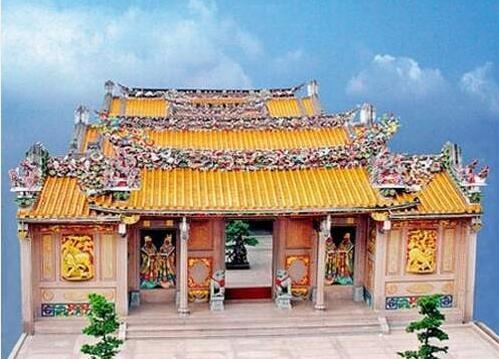神廟的名稱極多,有天后宮、九天玄女廟、武帝廟、文廟、城隍廟、三山國王廟、雙忠公廟、福德廟、土地廟等等。這些神廟和佛寺的最大區別是佛寺多為重檐歇山式,而神廟為祠堂式,特別是天井兩側多設有龍虎井。
